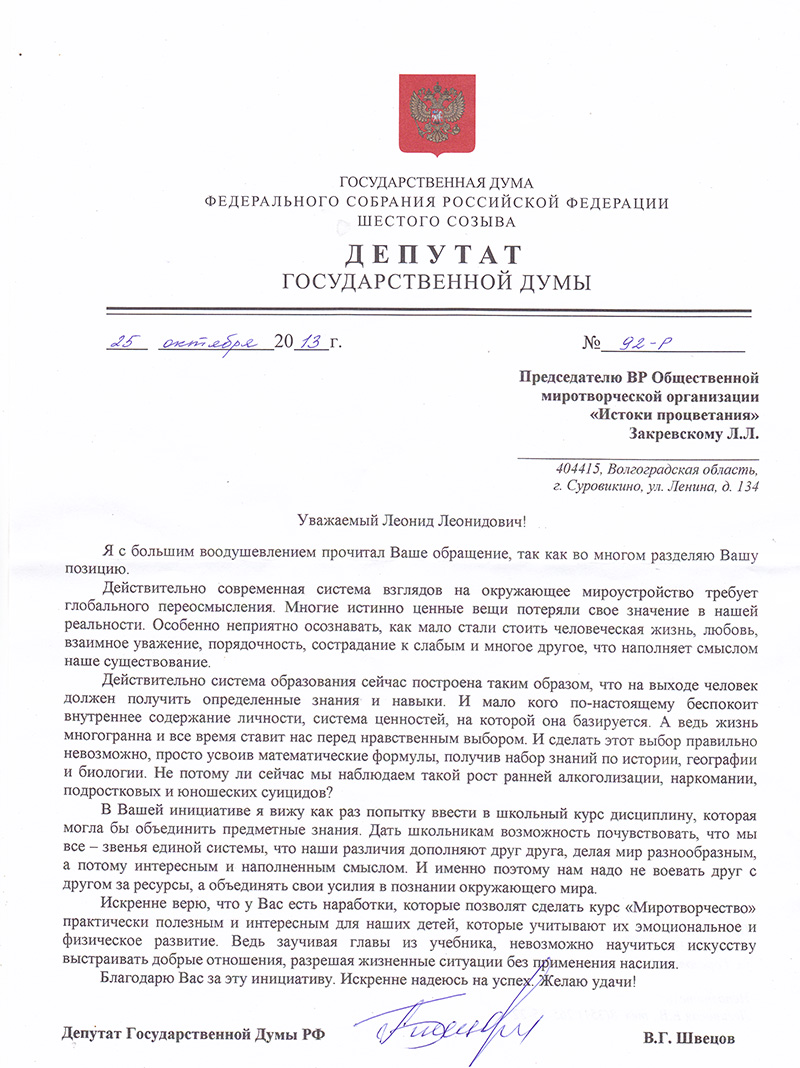 Ш03.2.1 13.11.05 Ответ Депутата ГД РФ Швецова В.Г. Автор: Администрация Дата: 2013-11-05